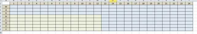 Le colonne identificate dalla numerazione 1-12 per i registri B, C, D, E ed F hanno un colore di sfondo differente per evidenziare il loro contenuto sinistro.
