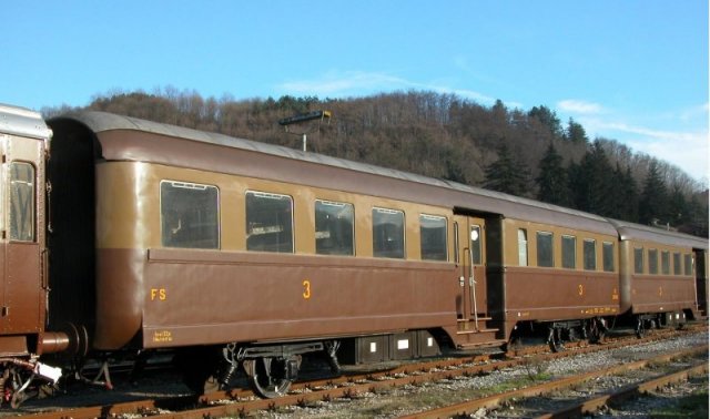 1948-1958 Le carrozze 'Corbellini' devono il loro nome al Ministro dei Trasporti che si occupò della risostruzione delle FS subito dopo la seconda guerra mondiale. Si tratta di carrozze economiche pensate per essere costruite in tempi molto rapidi, necessità assoluta in quegli anni. Sono caratterizzate dal grande vestibolo centrale di accesso, primo caso in Italia, che separa i due ambienti. La rigidità dei due assi, con un assetto di marcia assai scomodo, impose progressivamente la loro sostituzione con i carrelli (1959-1974). Il successo di questa soluzione si estese anche ad altre carrozze ottenute con la trasformazione di telai danneggiati o obsoleti. 1948-1958 The passenger cars 'Corbellini' inherit their name from the fist Italian Transport Minister after the War. They are economical cars with a simple project and short time to built, the most important feature in that period. There's a unique central entrance, first case in Italy, and two separated rooms. Two axles were very hard for the suspension and uncomfortable for the passengers, so they had been progressively substituted with boogies (1959-1974). The success of this solution was extended also to other passenger cars obteined with the transformation of damaged and old trucks. |